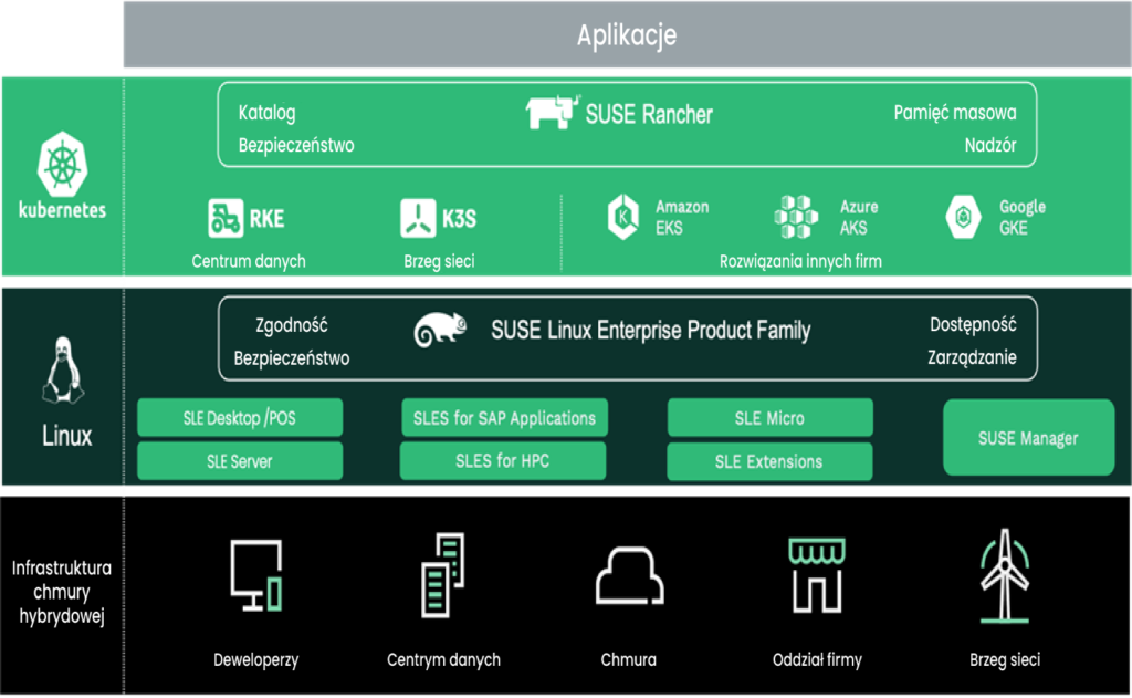SUSE Rancher do zarządzania systemem Kubernetes to rozwiązanie, które oferuje prostą, spójną i bezpieczną obsługę każdej certyfikowanej dystrybucji Kubernetesa, od centrum danych, przez chmurę, po brzeg sieci i dalej.